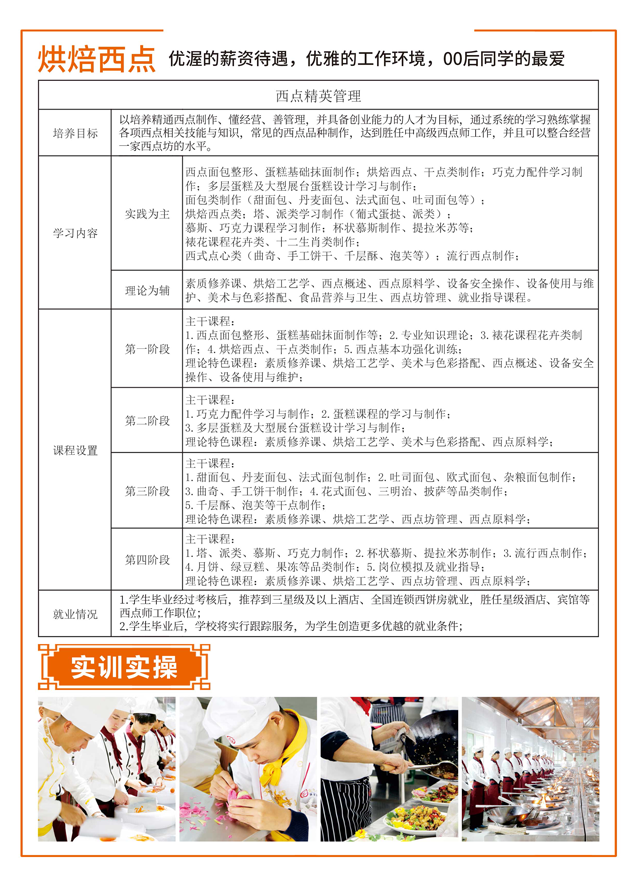 北方烹饪学校开设两年制经典西点专业、一年制西点精英专业和西点强化班。以培养精通西点制作,懂经营、善管理,并具备创业能力的西点人才为目标。全面系统传授国内外高端、前沿的西点及时尚饮品制作技术,让学员通过系统学习,熟练掌握烘焙、裱花技能成为适应烘焙行业需求的专业型人才。